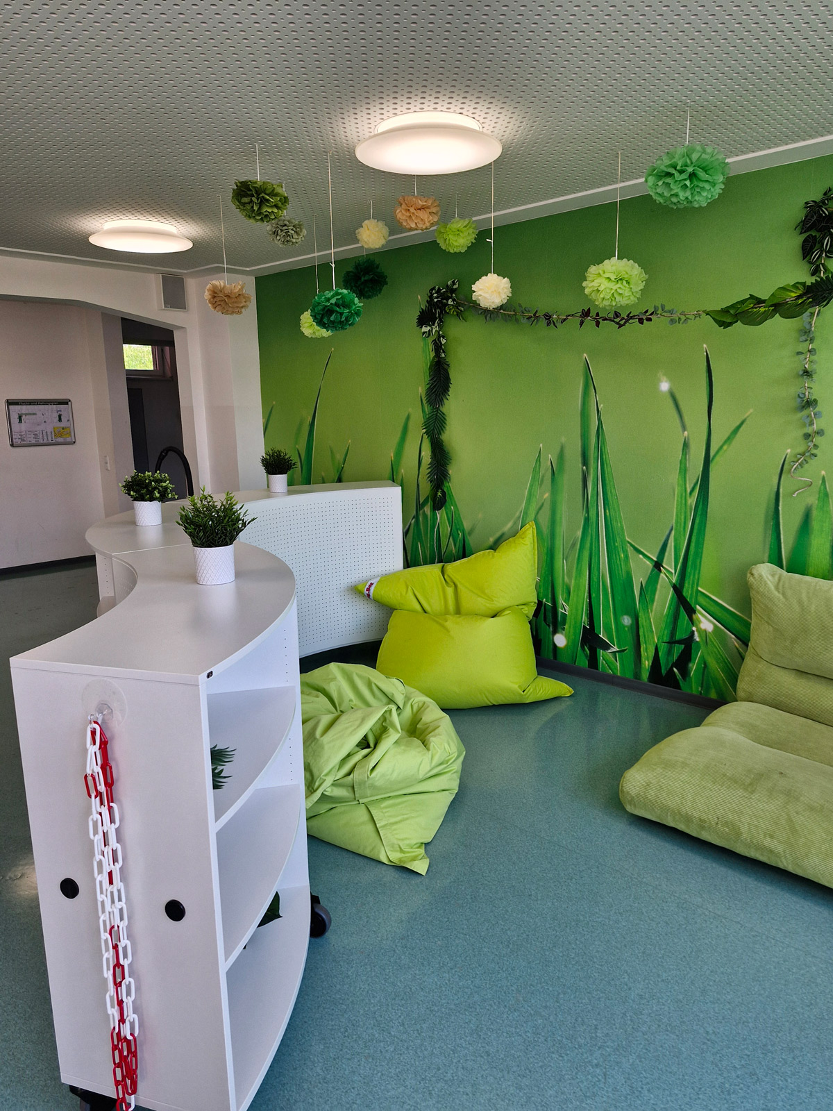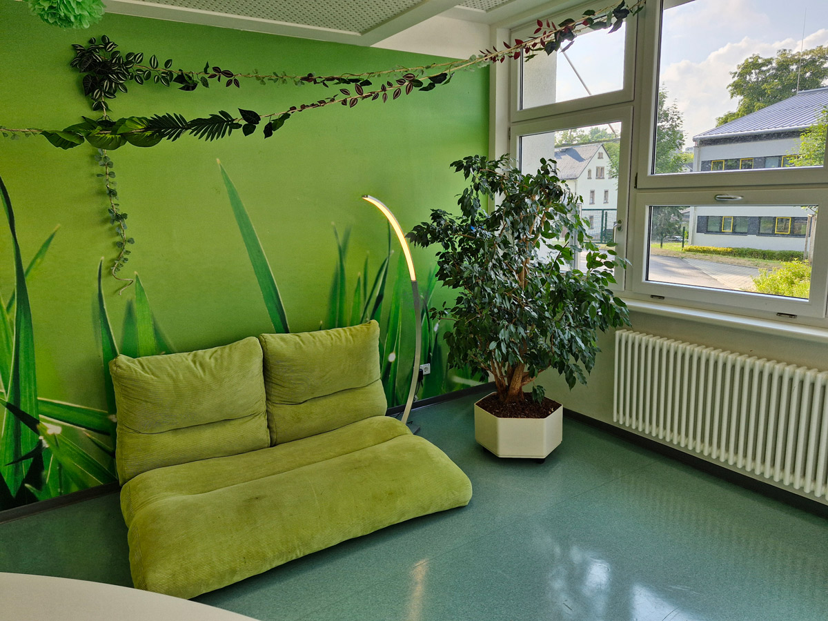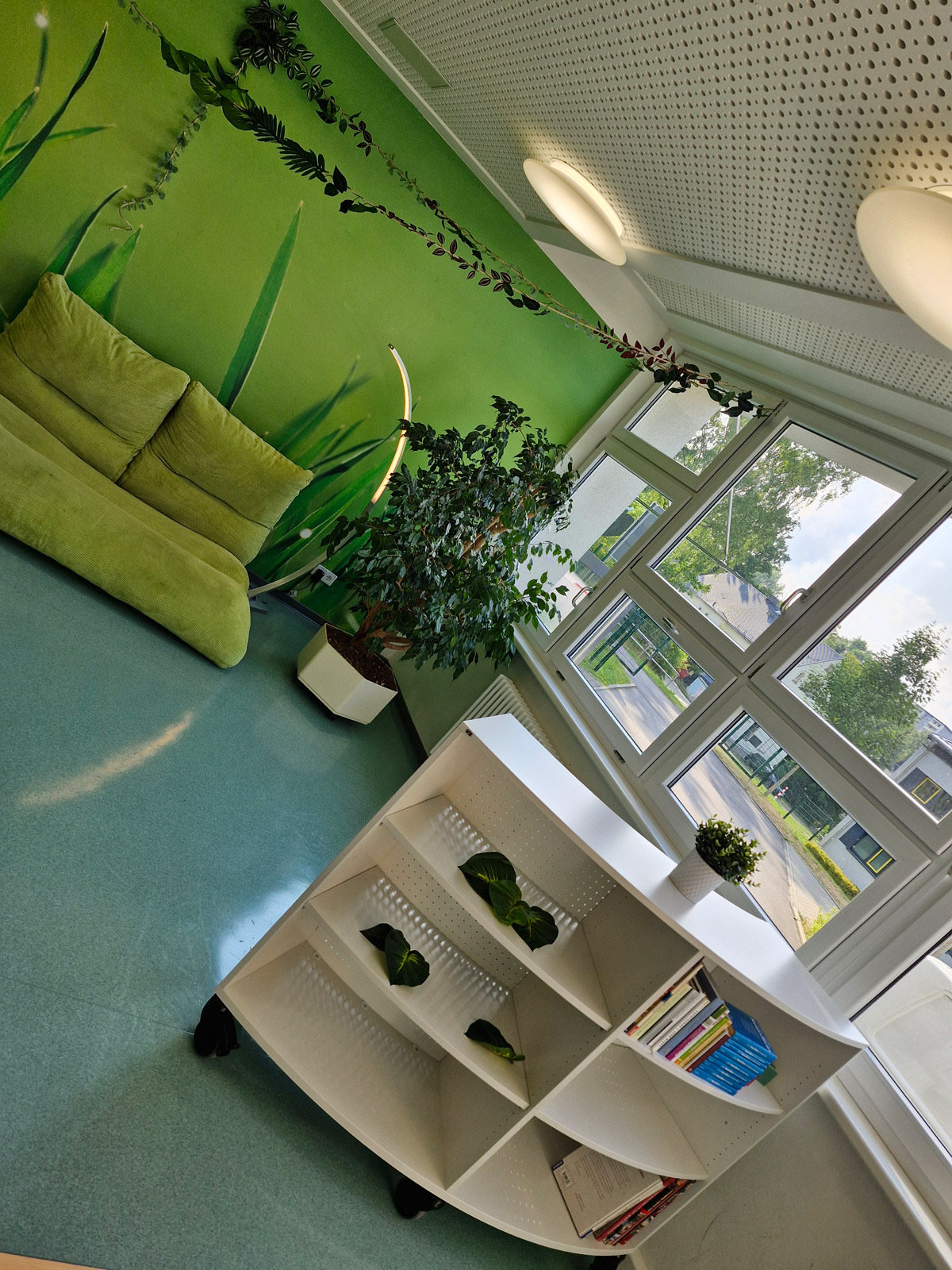 Die grüne Leseinsel ist nicht nur ein Ort der Worte, sondern auch ein Stück Natur im Schulalltag: Pflanzen und natürliche Materialien sorgen für eine angenehme Atmosphäre, in der Lernen und Entspannung wunderbar miteinander verbunden werden können.
